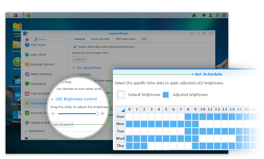 DS216j 配備可調整亮度的 LED 指示燈,讓你可以針對前方面板的 LED 燈進行四種明暗度及排程設定,根據(jù)所處環(huán)境決定舒適的亮度。