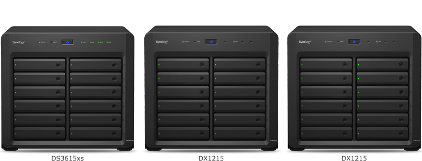 擁有 12 個硬盤托盤的 DS3615xs,通過連接至兩臺 DX1215 擴充設備2,總容量可擴充至最多 216TB3,并能快速將單一存儲空間的容量實時擴充至 108TB。當存儲空間接近上限時,DS3615xs 可輕松擴充至多達 36 顆一般硬盤或 SSD 硬盤,提供靈活擴充的容量及均衡的效能,能符合不同應用程序及程序的需求。