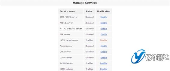 當 iSCSI 卷創(chuàng)建完成后,接下來是開啟“iSCSI target server”系統(tǒng)服務。點擊“Services”菜單,在右側的“Services section”區(qū)域選擇“Manage Services”。然后將系統(tǒng)服務列表中的“iSCSI target server”設置為“Enabled”狀態(tài),從而使得系統(tǒng)能夠對外提供基于 iSCSI 協(xié)議的虛擬存儲服務。如圖