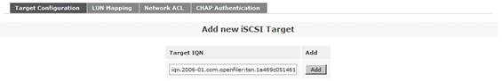 接下來是添加一個 iSCSI Target。首先點擊菜單“Volumes”,然后在右側的“Volumes section”區(qū)域中選擇“iSCSI Targets”。在“Target Configuration”子菜單中的“Add new iSCSI Target”區(qū)域,選擇列出的“Target IQN”。最后點擊“Add”按鈕,從而添加了一個 iSCSI Target。注意,此處的 Target IQN 信息在后面的對 ESX 服務器的存儲配置過程中會用到。如圖