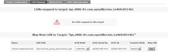 接下來點擊“LUN Mapping”子菜單,保持其余默認選項,點擊“Map”選項。從而實現(xiàn)從 LUN 到剛剛配置好的 iSCSI Target 之間的映射。如圖