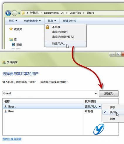 上述設(shè)置完畢,即可在Windows 7下開啟某個(gè)文件夾的共享功能,使得Mac電腦可以讀取甚至寫入文件的目的。打開需要共享的文件夾——在窗口上方的“共享”下拉菜單中點(diǎn)擊“特定用戶…”——在彈出的選項(xiàng)窗總添加“Guest”,并將權(quán)限級(jí)別進(jìn)行相應(yīng)設(shè)置。