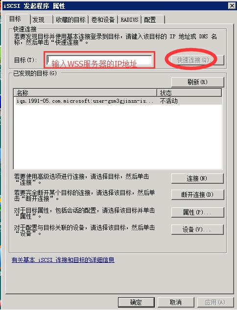 2. 打開(kāi)ISCSI 配置界面,在目標(biāo)中輸入WSS服務(wù)器的IP地址,然后點(diǎn)擊"快速連接",當(dāng)連接成功后完成后續(xù)配置。